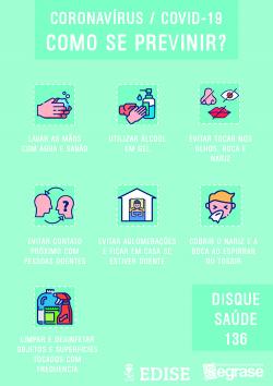 Também foi desenvolvido pela Assessoria de Comunicação e Designer da Segrase cartazes sobre a importância da prevenção do coronavírus. O material foi distribuído nos murais e entrada da Empresa e também enviado para o e-mail de todos os servidores.