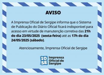 A Imprensa Oficial de Sergipe (IOSE), torna público a informação de que o sistema de publicação do Diário Oficial ficará indisponível para acesso ao público, em virtude de manutenção corretiva, das 21h do dia 23/05/2025 (sexta-feira) até as 17h do dia 24/05/2025 (sábado). A direção da IOSE agradece a compreensão de todos.